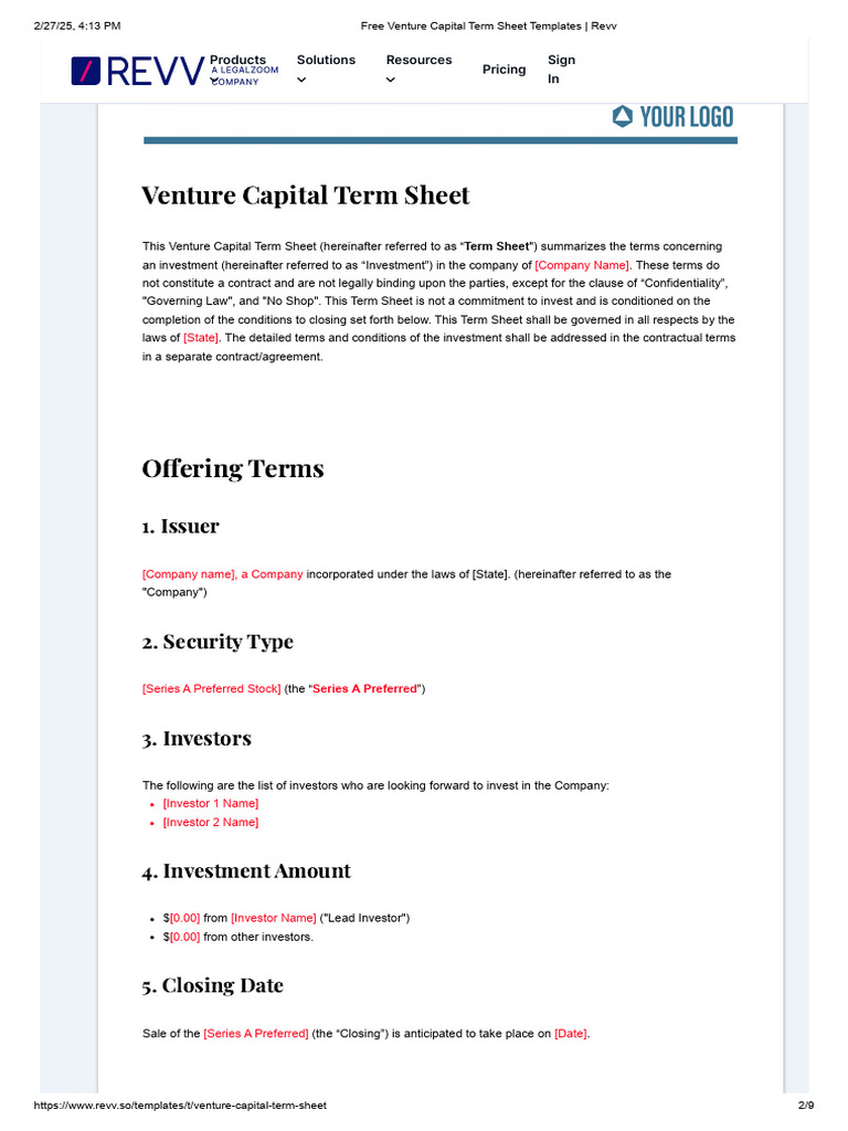 Venture Capital Term Sheet Templates Revv PDF Stocks Dividend