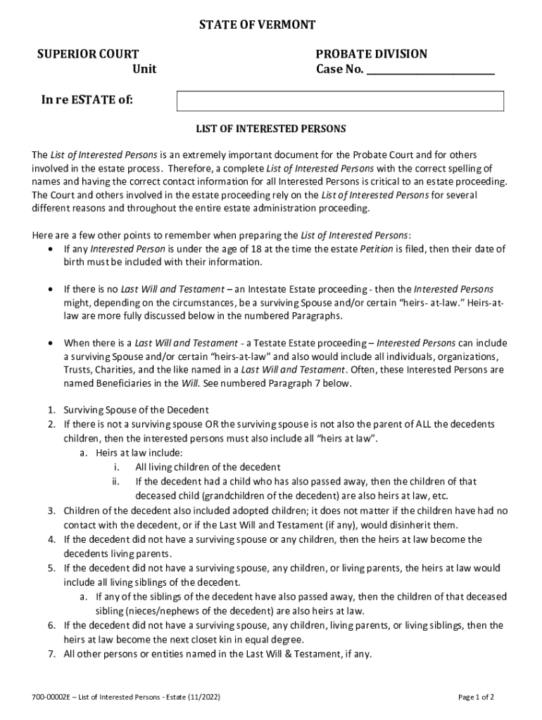 Fillable Online STATE OF VERMONT SUPERIOR COURT PROBATE DIVISION