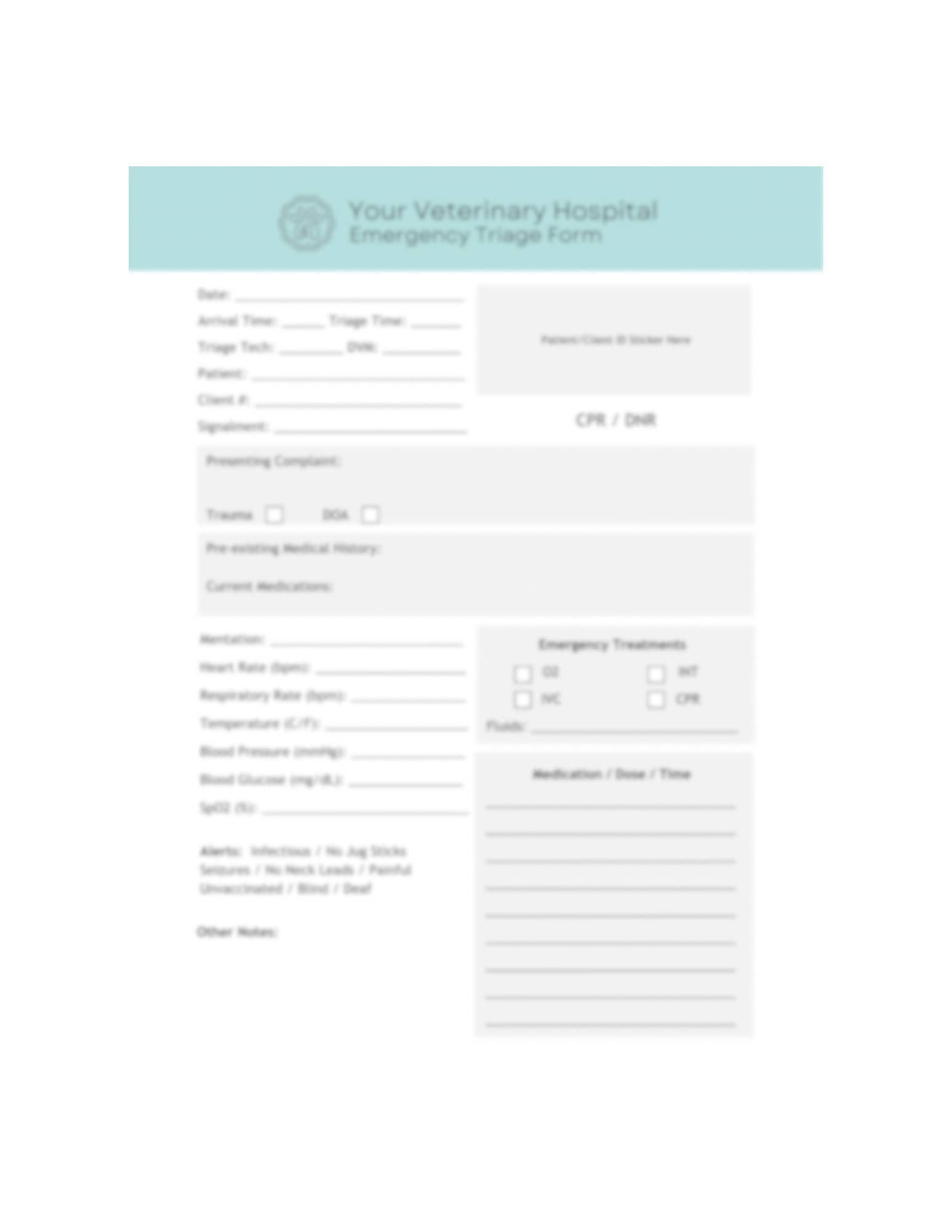 Veterinary Emergency ER Triage Intake Form Printable Vet Clinic