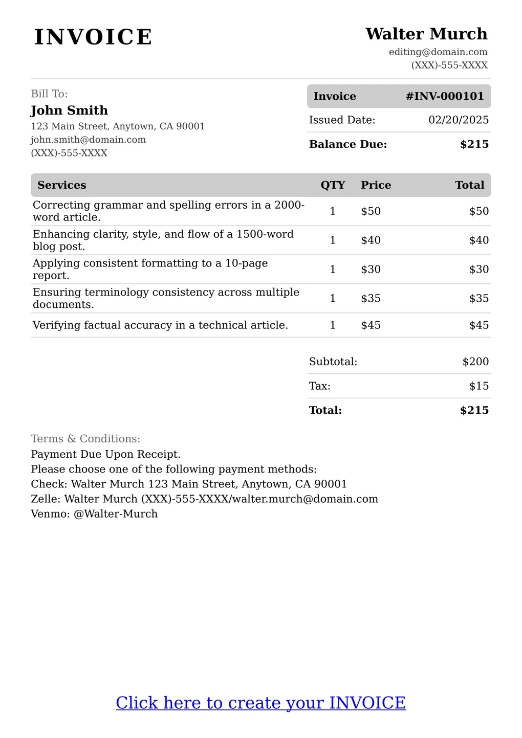 Sample Invoice for Writing Editing Work Editing writing Invoice