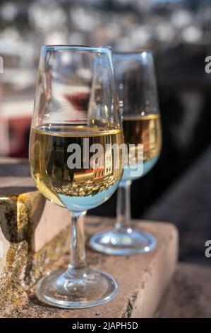 Tasting of sweet and dry fortified Vino de Jerez sherry wine with view