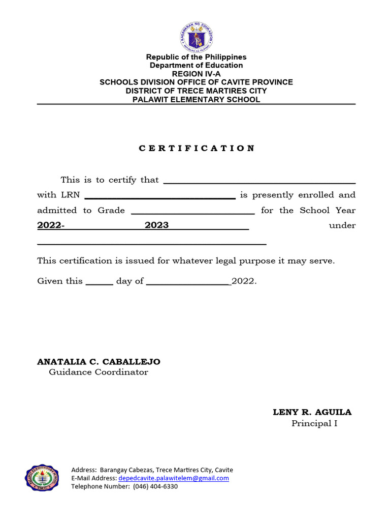 Certificate of Enrollment Elementary School