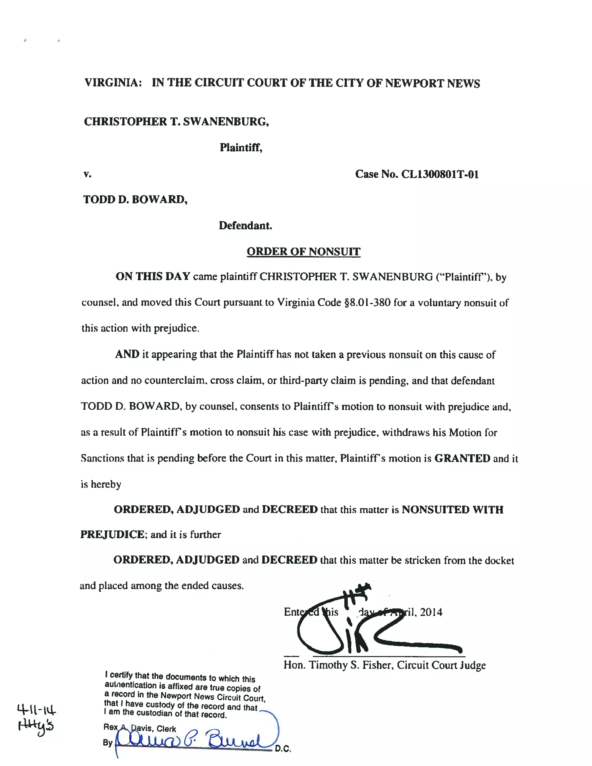 Swanenburg Nonsuit Order in Tortious Interference Case PDF