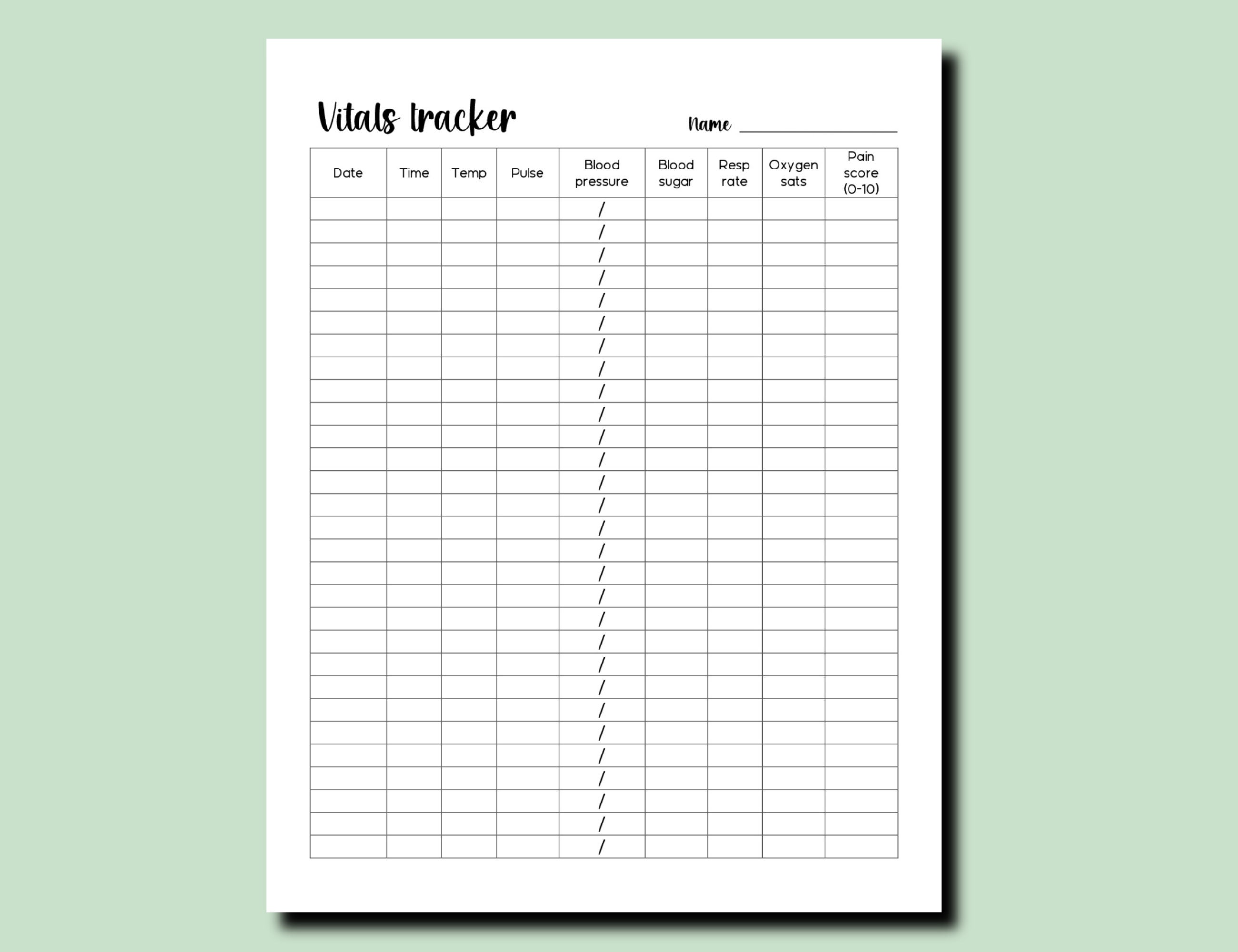 Printable Vitals Sheet Vital Signs Log Blood Pressure Tracker Vitals