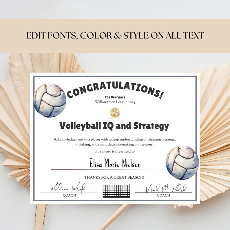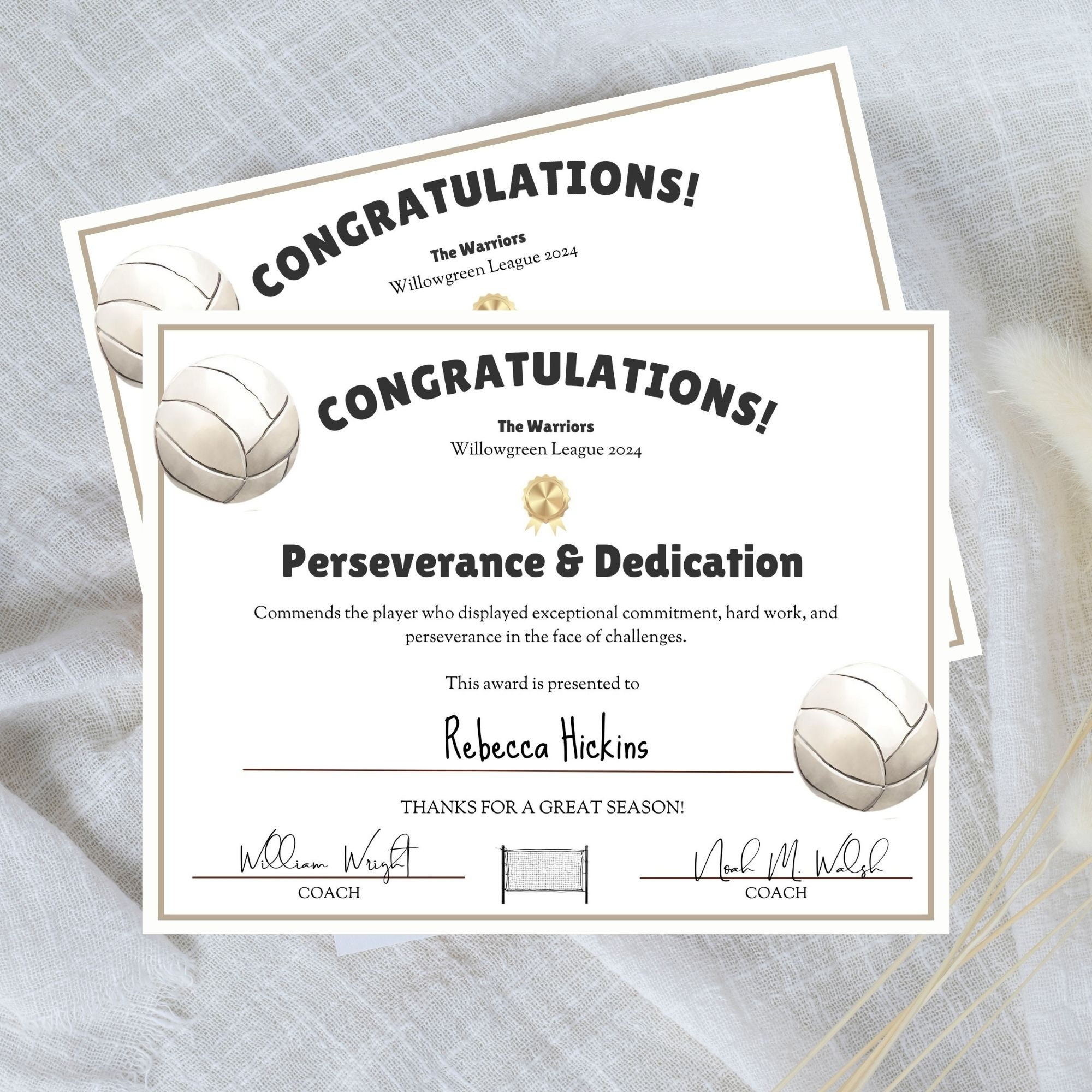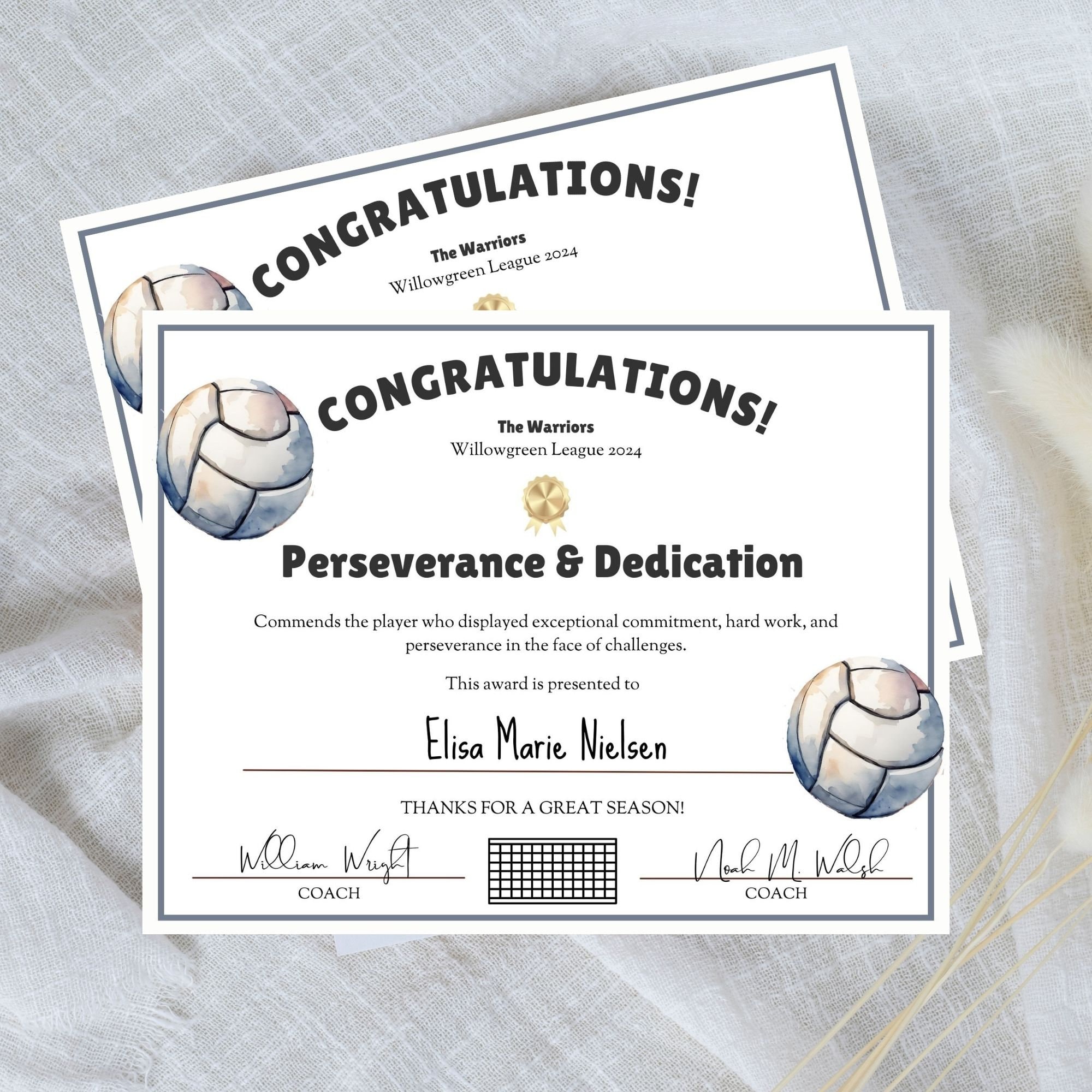 Editable Printable Volleyball Team Certificate End of Season Custom