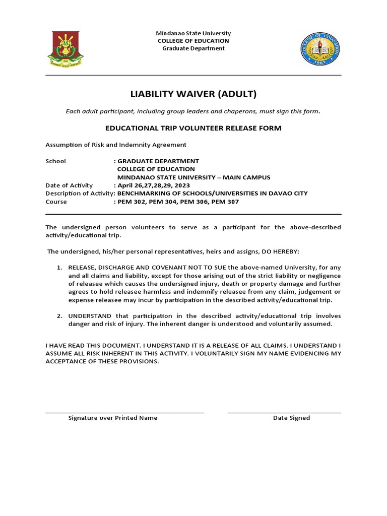 Liability Waiver (Adult) : Educational Trip Volunteer Release Form PDF