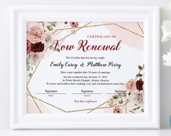 Vow Renewal Certificate Printable Certificate of Vow Renewal Etsy