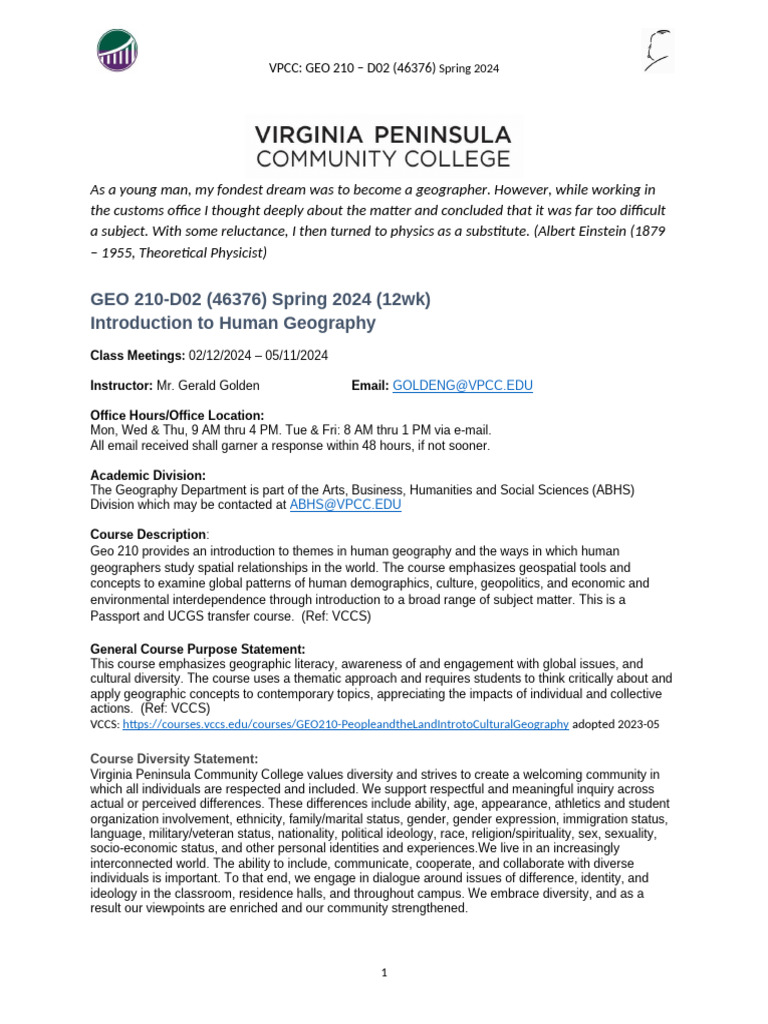 VPCC Sp24 Geo 210 d02 (46376) Syllabus PDF Academic Dishonesty
