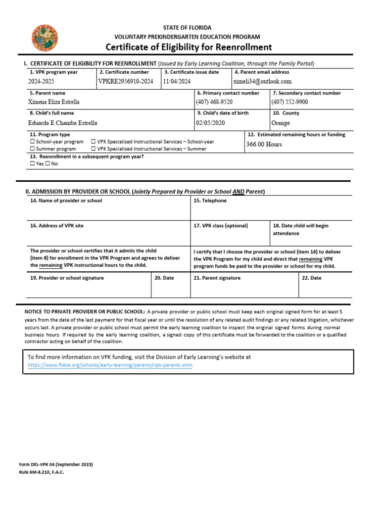 OEL VPK Reenrollment Certificate of Eligibility PDF Wellness