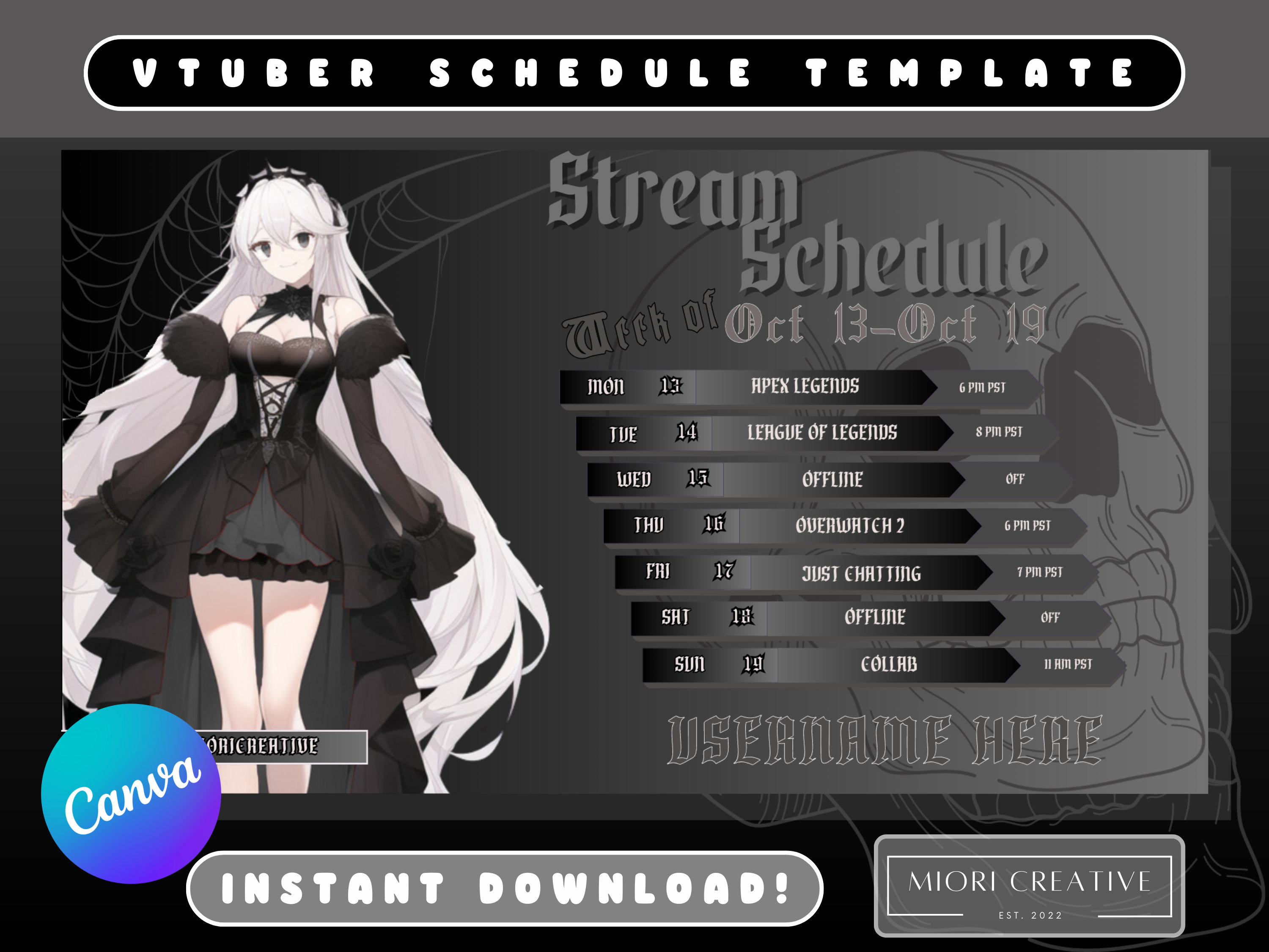Gothic Vtuber Schedule Goth Twitch Schedule Template Black Etsy