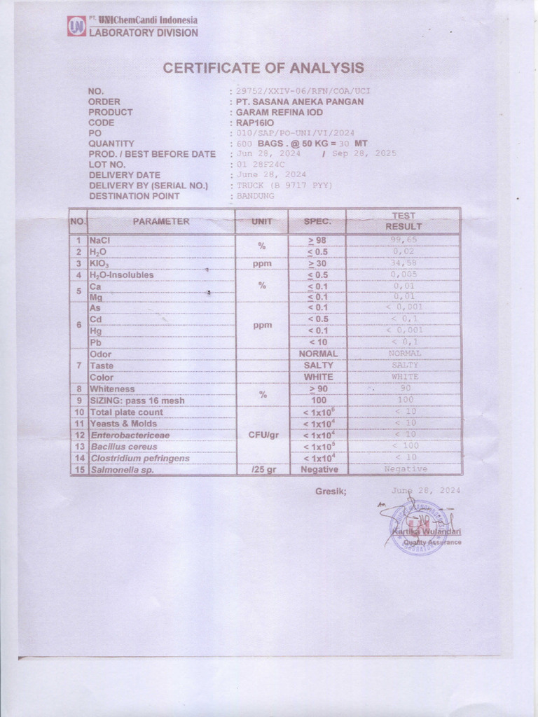 Certificate of Analysis for 96% Ethyl Alcohol (Ethanol) from PT