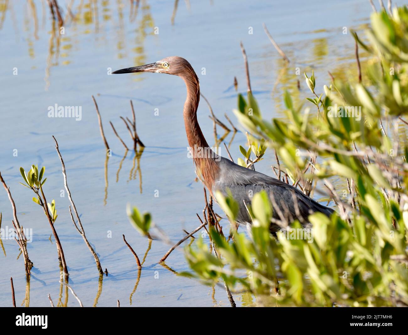 A lone Reddish Egret (Egretta rufescens) wading in shallow water and
