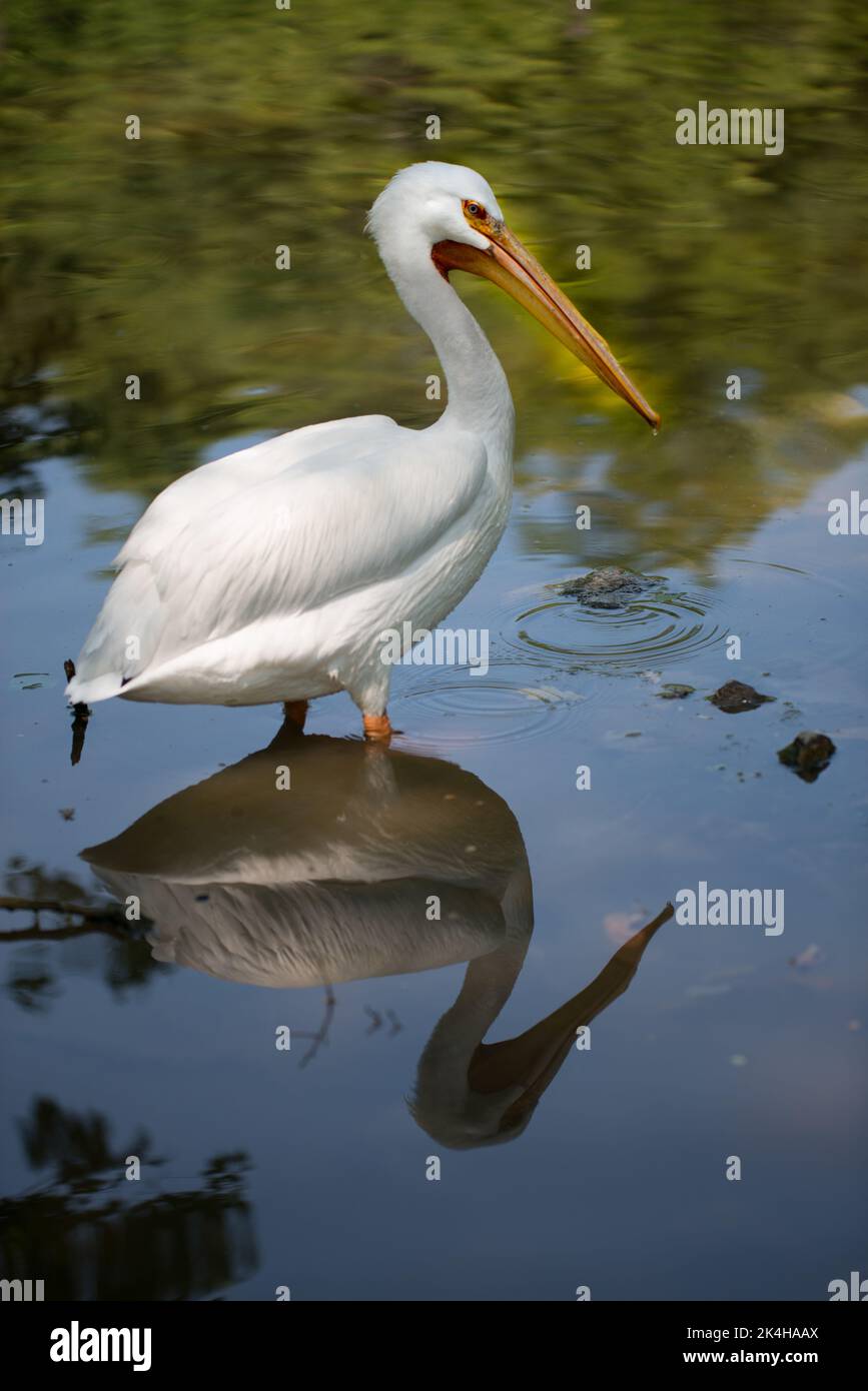 A vertical shot of a white pelican wading in a pond Stock Photo Alamy