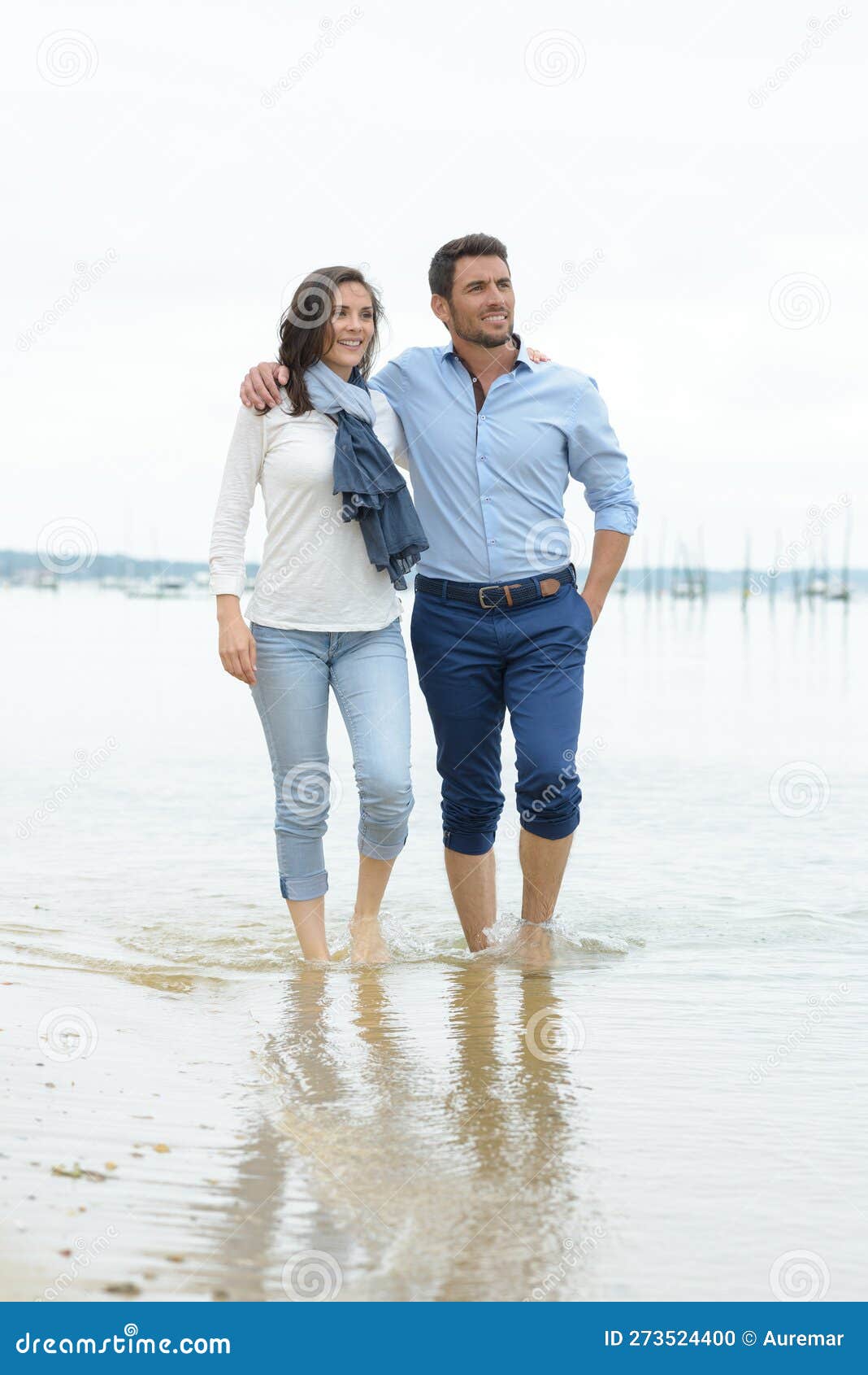 Couple Walking Leisurely on Beach while Holding Hands Stock Photo