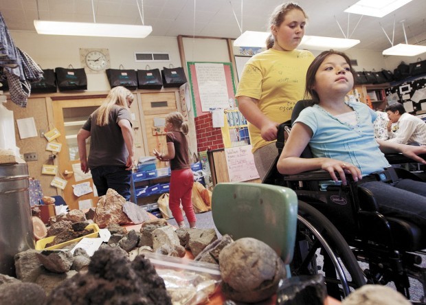 Wallace Elementary students line up to help chair bound classmate