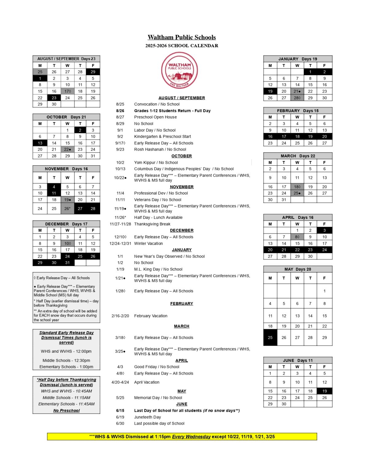 Waltham Public Schools Calendar 2025 26 Damara Sharyl