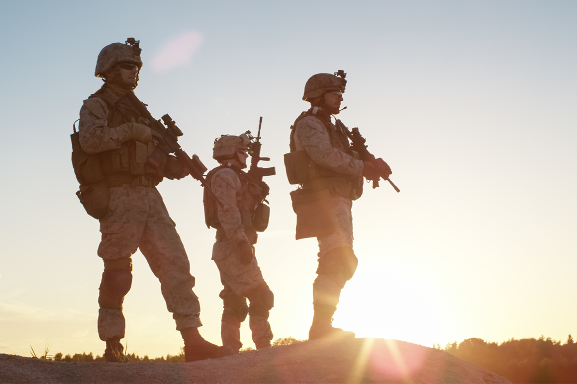 War Concept Military fighting scene on war sky background Soldiers