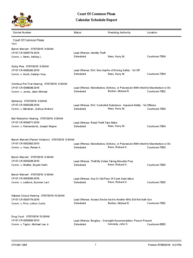 York County Court Schedule For Aug 15 PDF Courtroom Contempt Of
