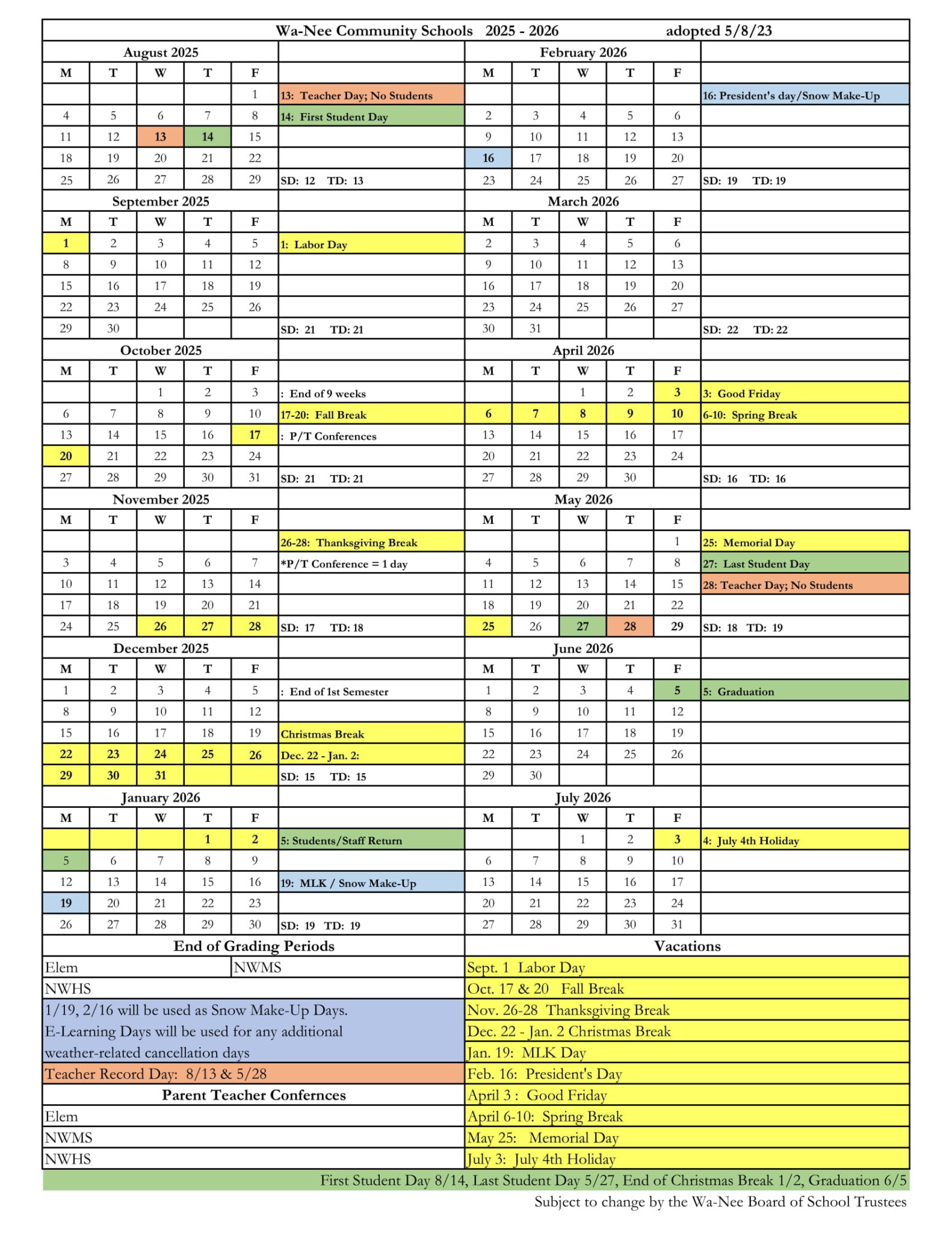 Wa Nee Community Schools Calendar 25 26 Revised PDF EduCounty