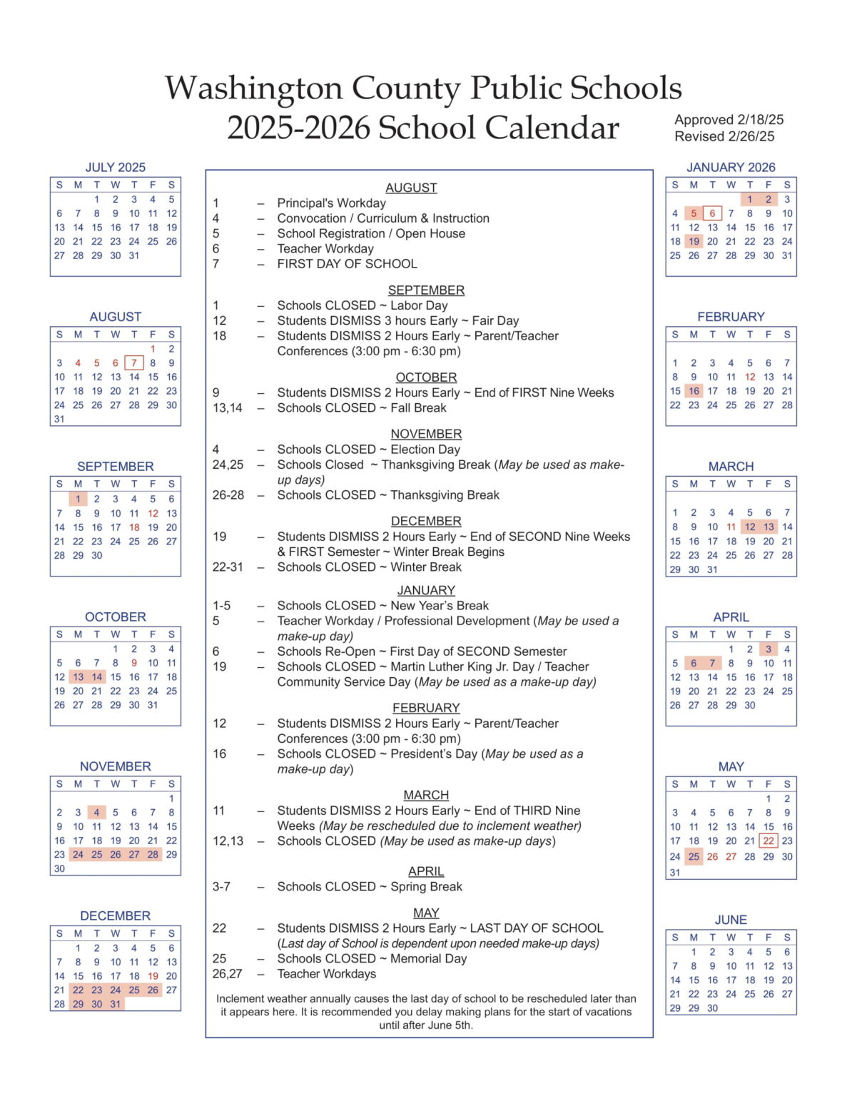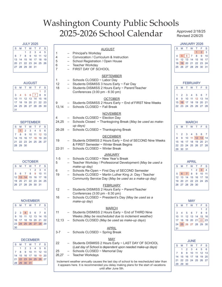 Washington County va Public Schools Calendar 25 26 Revised PDF