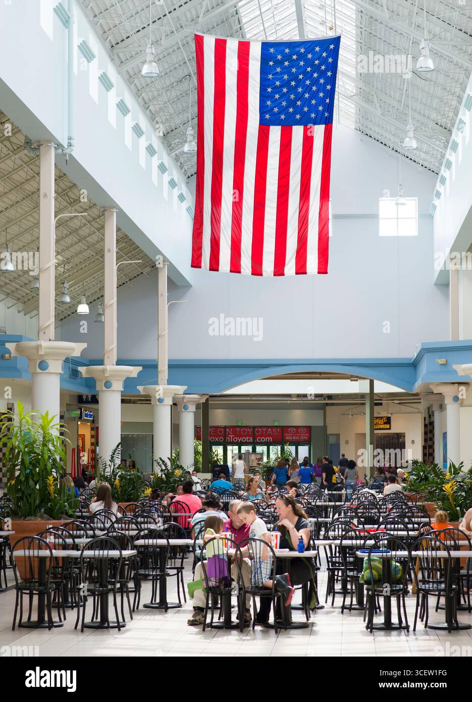 Large American flag hanging over the food court at The Outlet