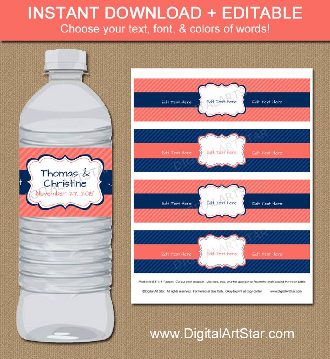 Coral and Navy Water Bottle Labels Navy and Coral Drink Wrappers