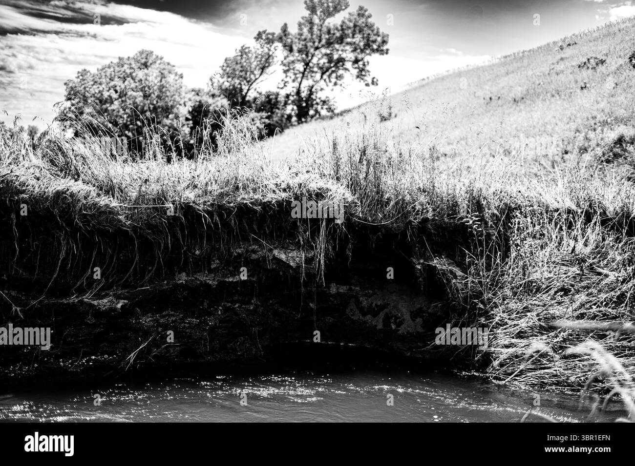 Soil erosion at drop off into a creek showing exposed roots and dirt