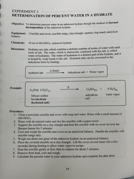 Solved EXPERIMENT 3 DETERMINATION OF PERCENT WATER IN A Chegg com