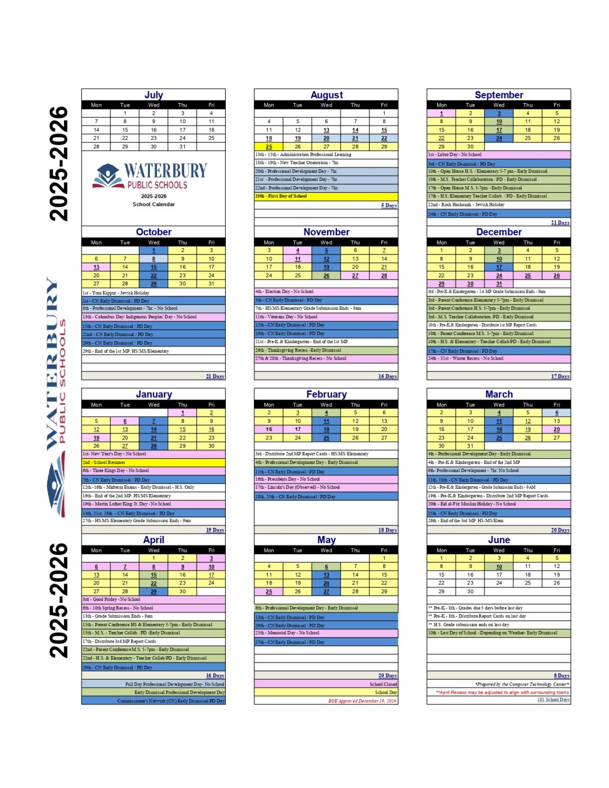 Waterbury Public Schools Calendar Holidays 2025 2026