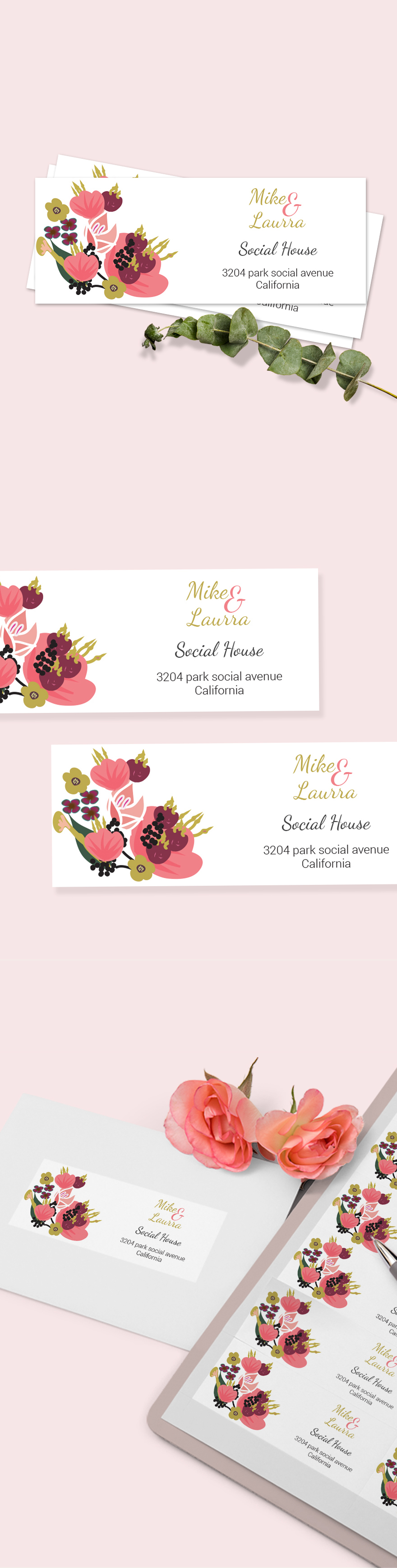 Pink Floral Wedding Address Labels Card Design Template in PSD Word