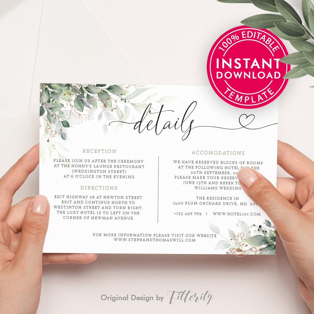 Wedding Details Card Template Fully Editable Printable Wedding