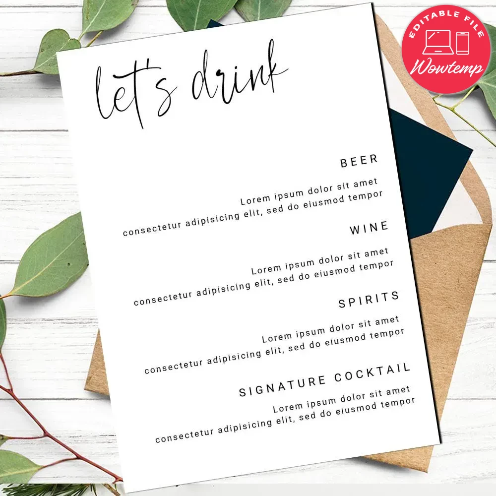 Editable Minimal Wedding Drink Menu Template Instant Download Wowtemp