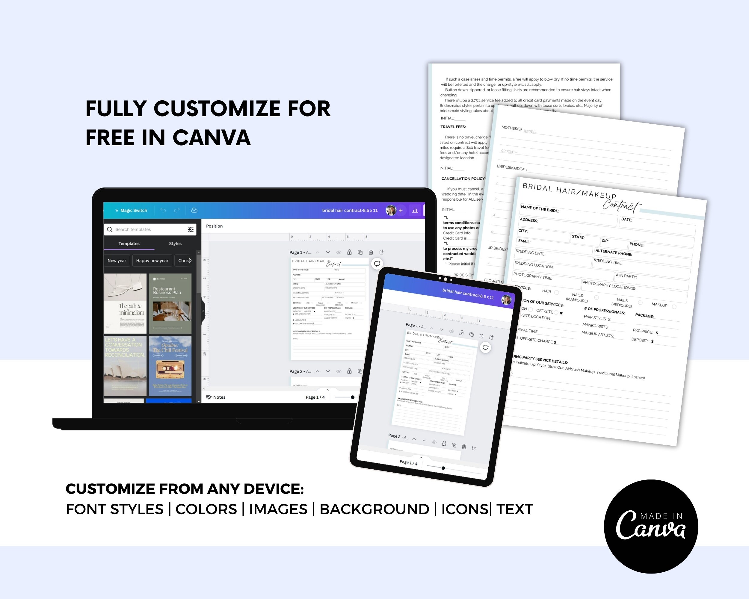 Bridal Hair and Makeup Contract Template Printable and Fully Editable