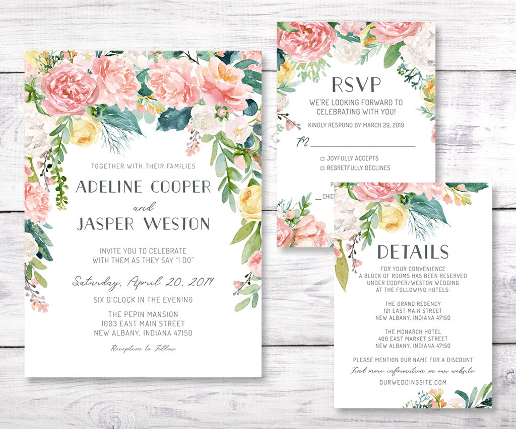 Watercolor Effect Floral Wedding Invitation Suite Templates Layout