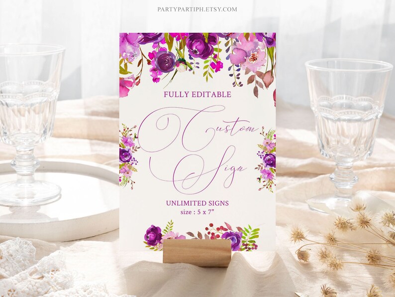 Editable Purple Flowers Custom Wedding Table Signs Template Instant