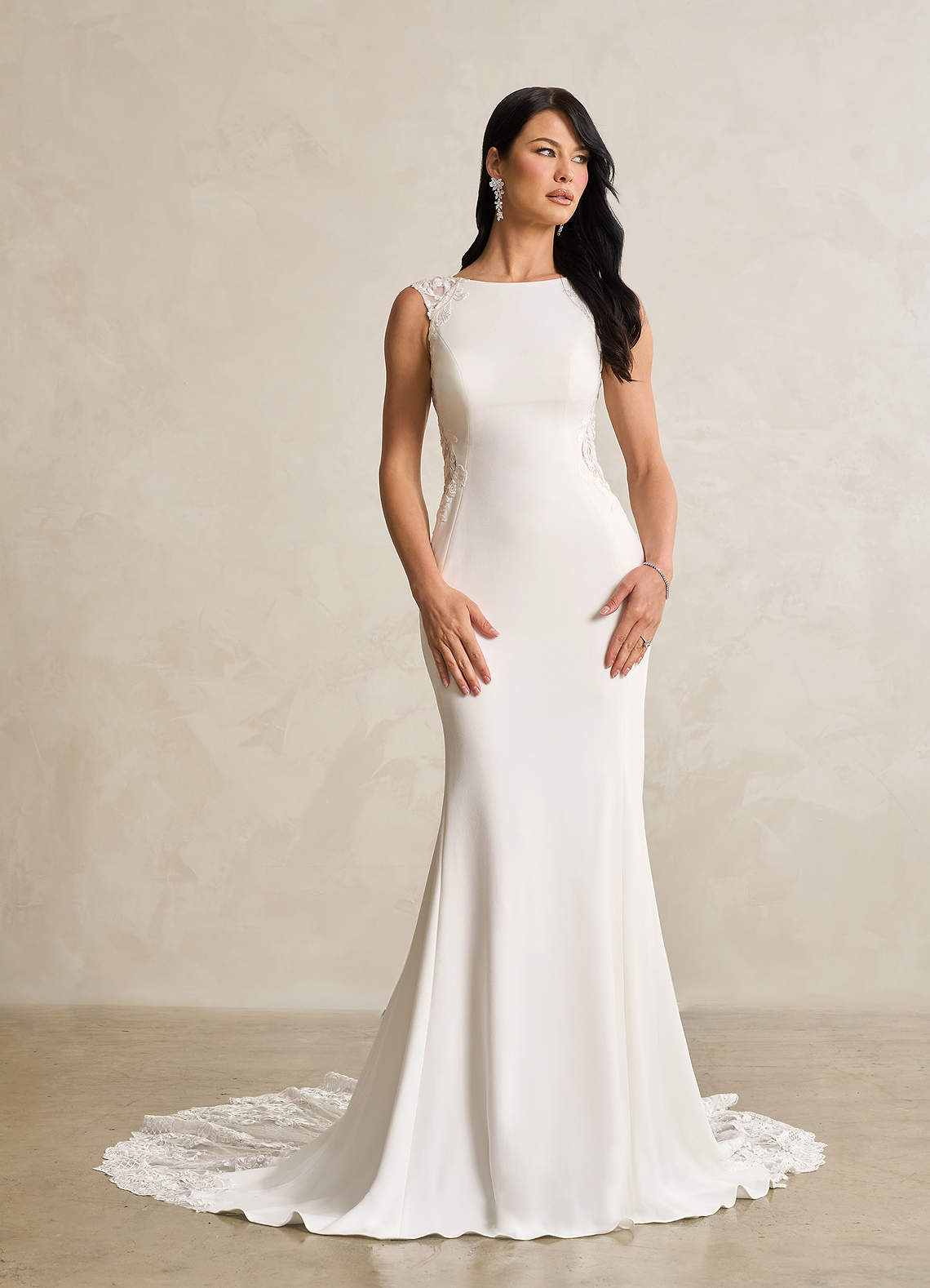 Diamond White Azazie Elias Mermaid Lace Stretch Crepe Cathedral Train