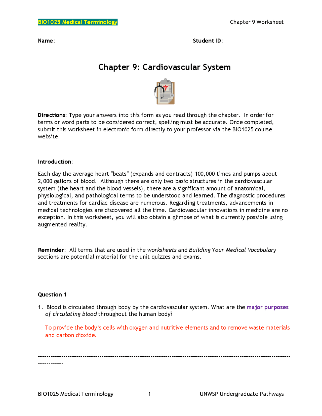 Module 9 Cardiovascular Medical Terminology Worksheet pdf OO0 Week