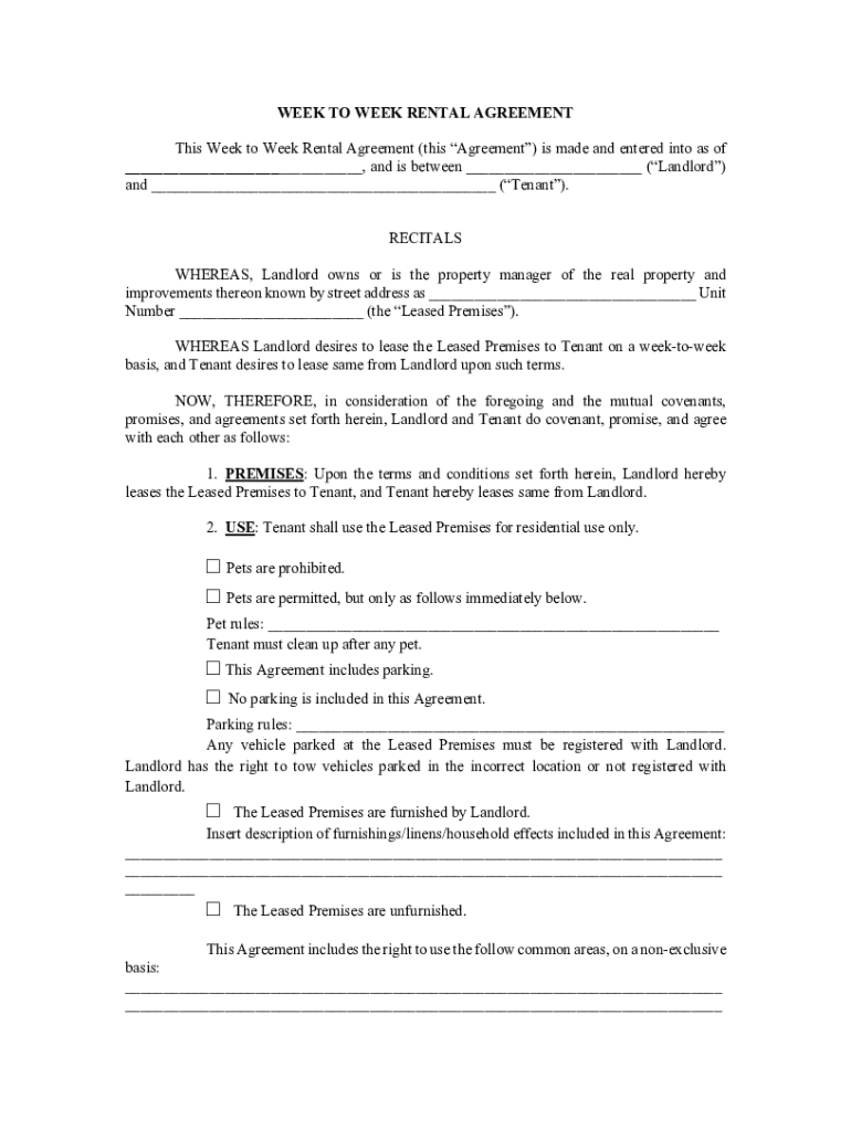 Blank Week To Week Rental Agreement Template PDF Minasinternational