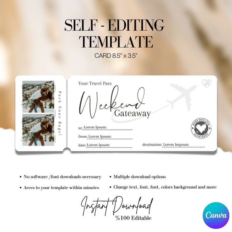 Weekend Getaway Voucher With Photo Editable Travel Pass Ticket
