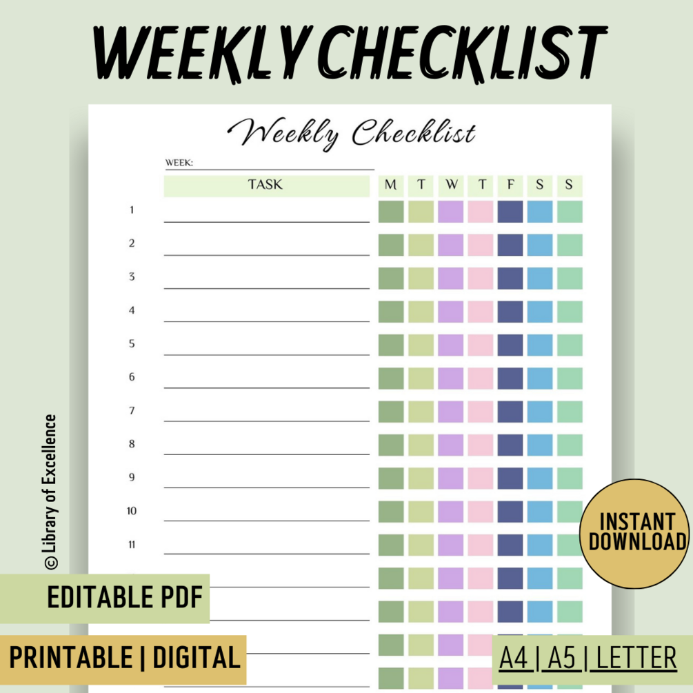 Weekly Checklist Printable PDF Template A4/a5/letter (3 Colors
