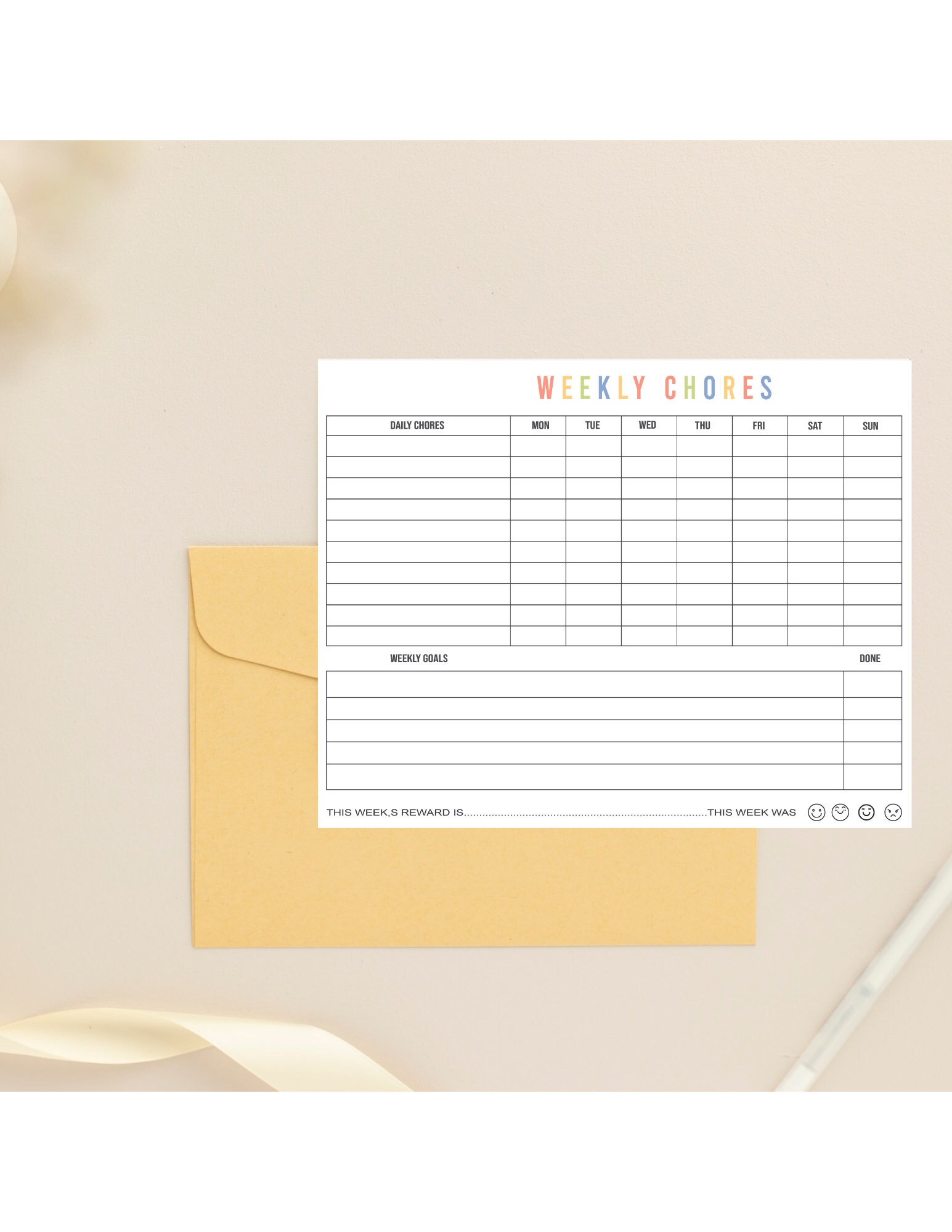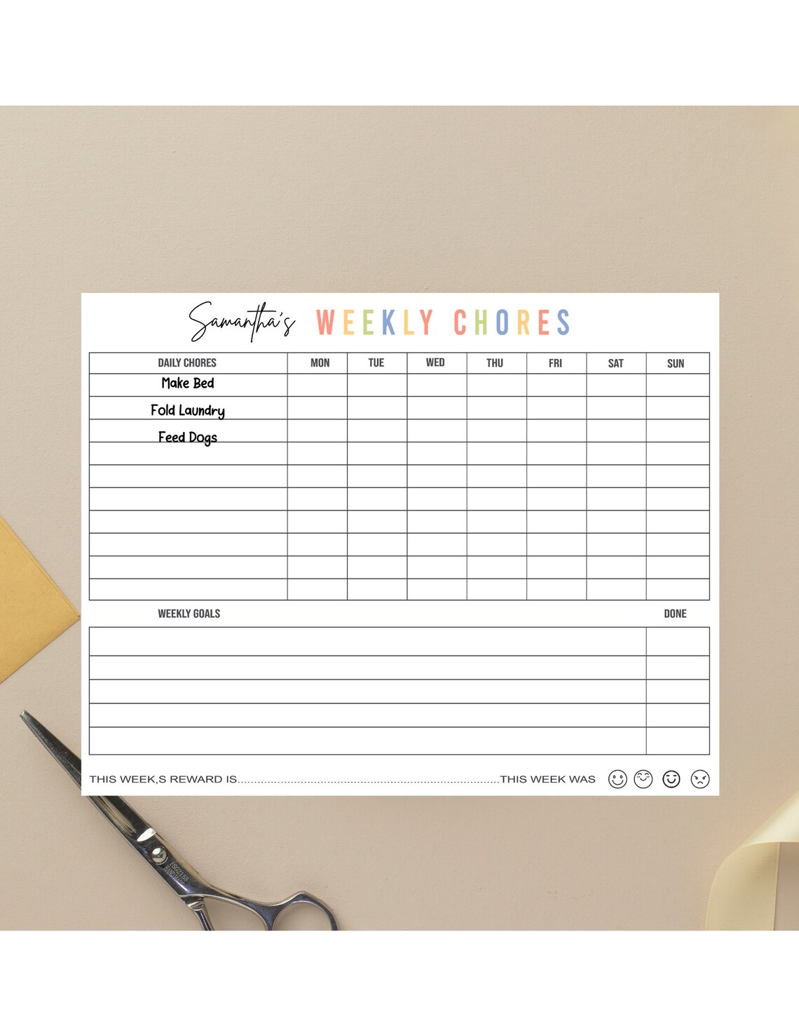 Weekly Chore Chart for Kids Instant Digital Download Printable