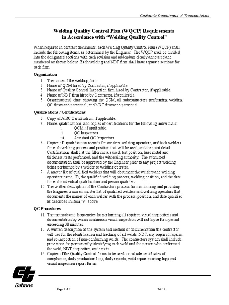 Caltrans Welding Quality Control Plan Requirements PDF