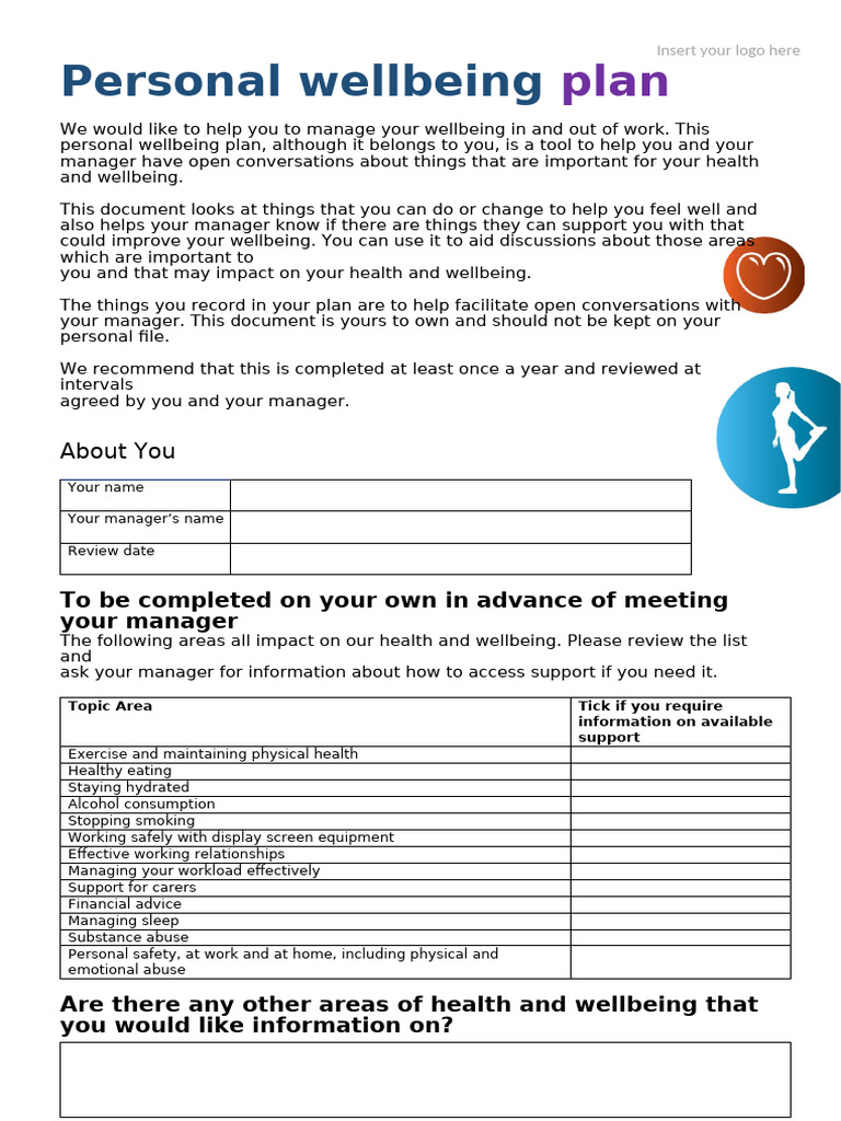 Personal Wellbeing Plan Template PDF Health Care