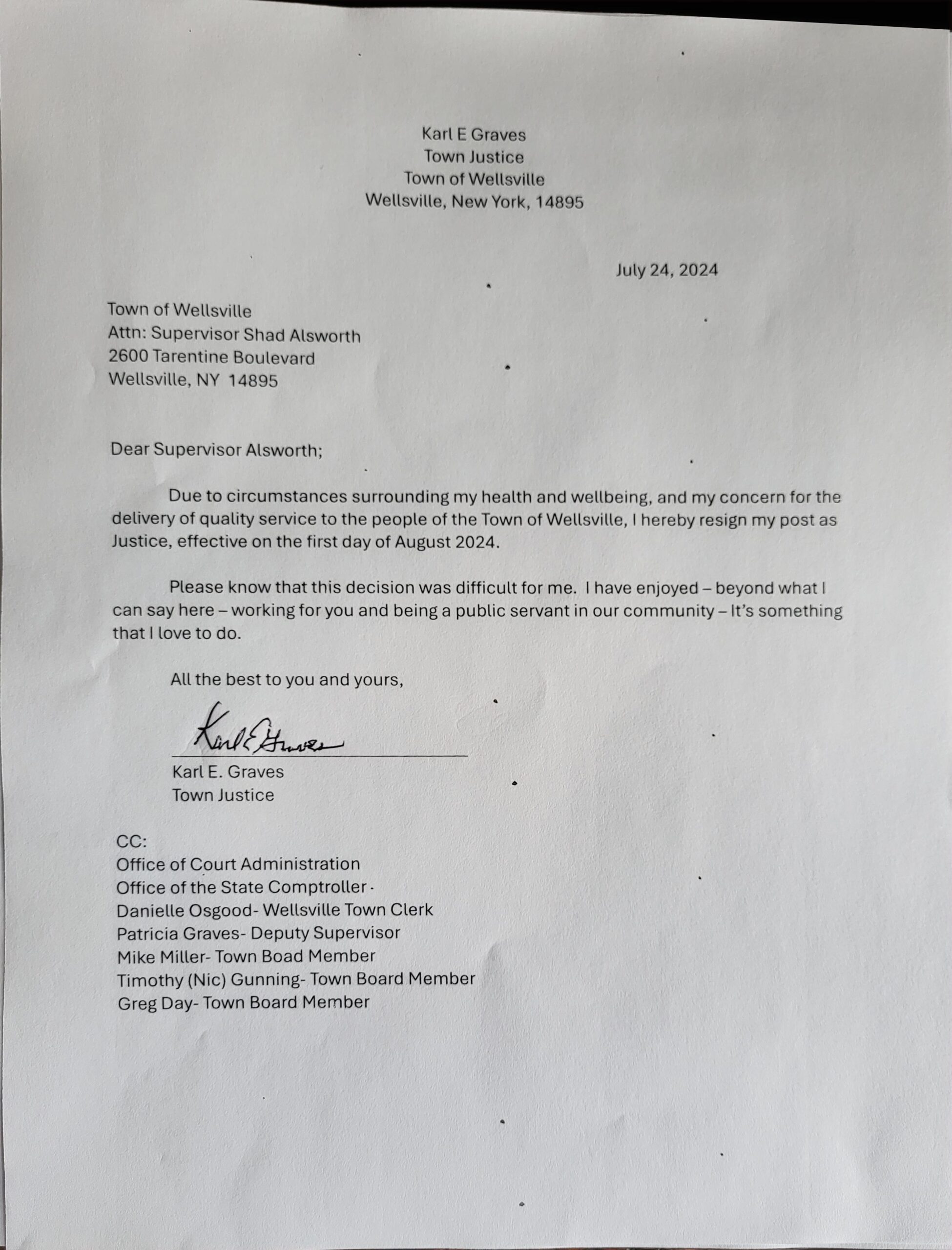 Town of Wellsville Justice Karl Graves steps down for his quot health and