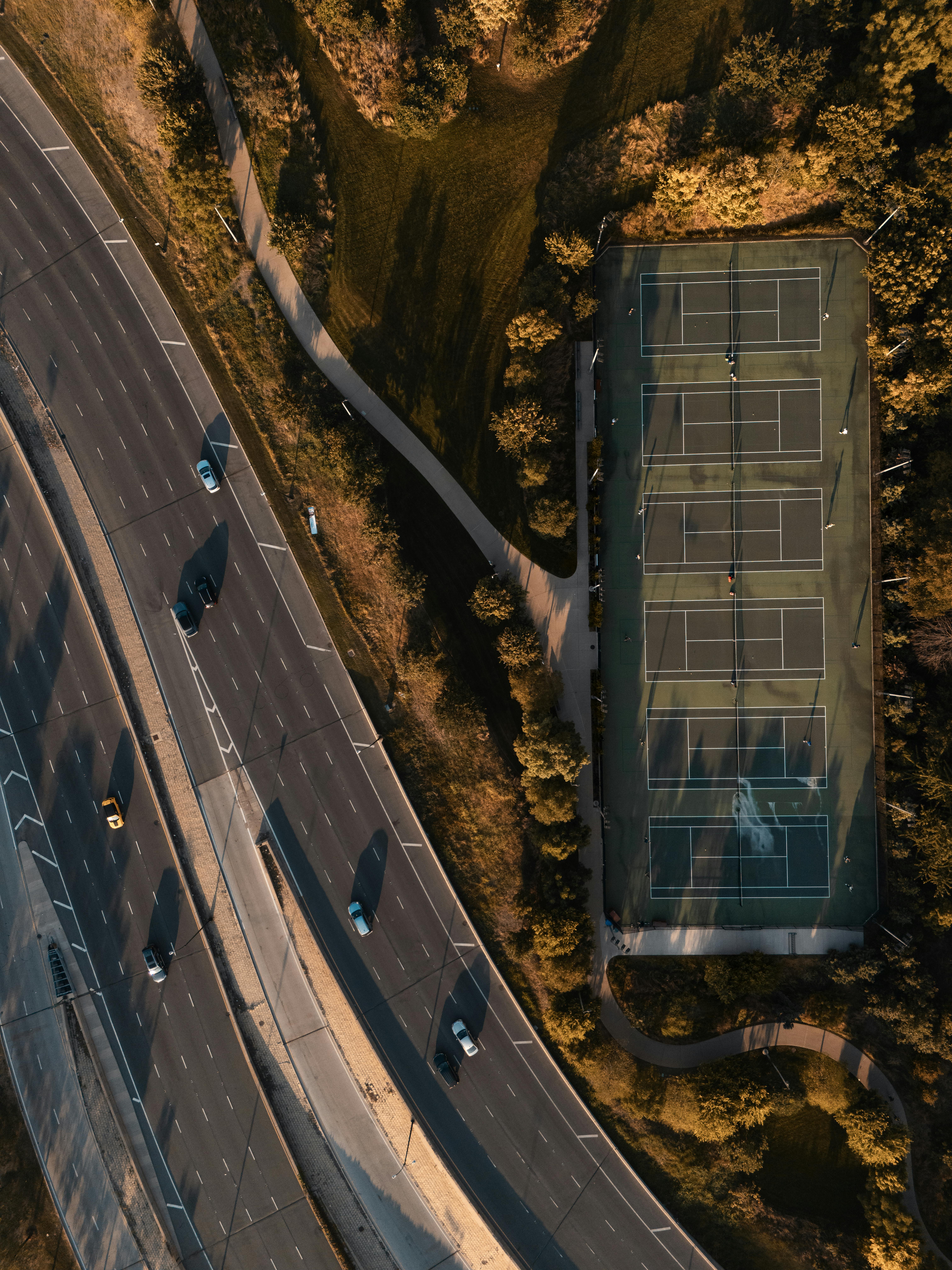 Aerial View of Tennis Courts and Highway at Dusk · Free Stock Photo