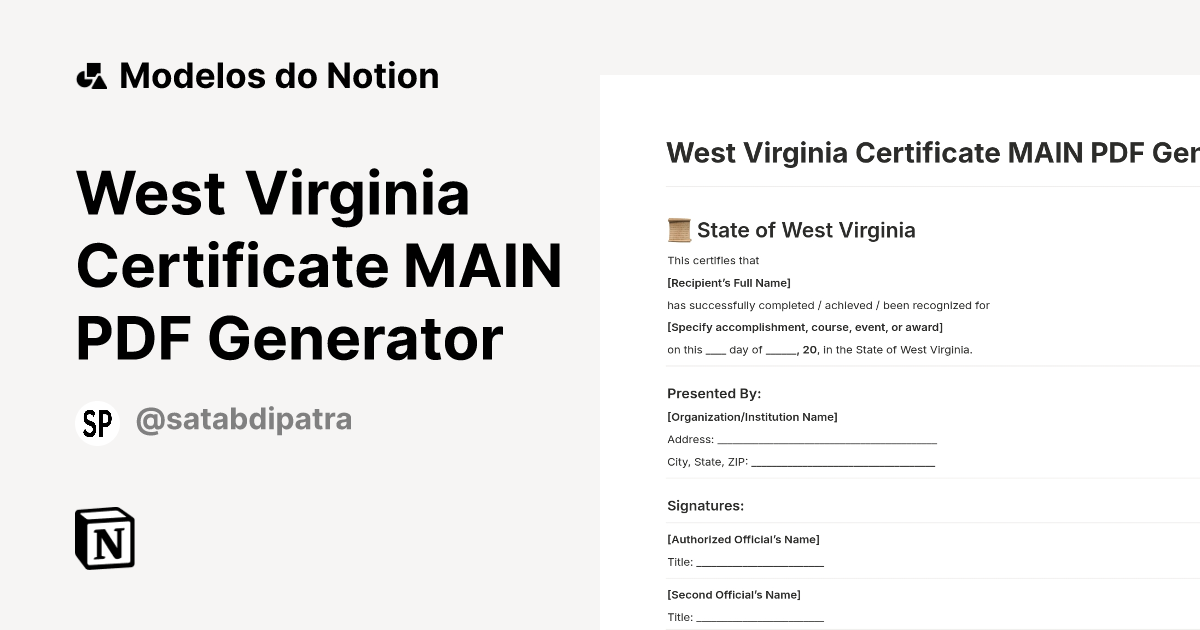 Modelo West Virginia Certificate MAIN PDF Generator Marketplace do Notion