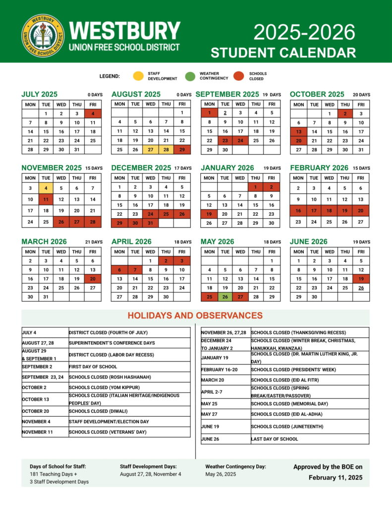 Westbury Union Free School District UFSD Calendar 25 26 PDF revised
