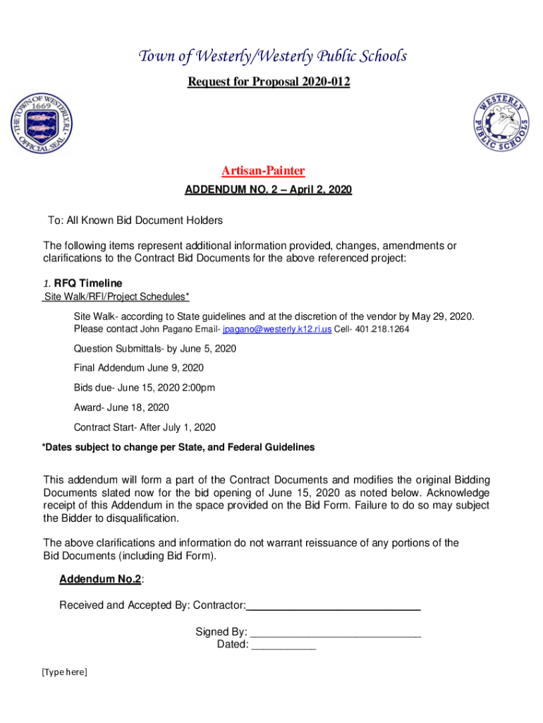 Fillable Online purchasing ri Westerly Public Schools Bid