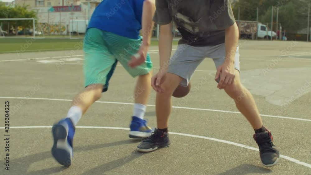 Low section of streetball defender stealing the ball catching the