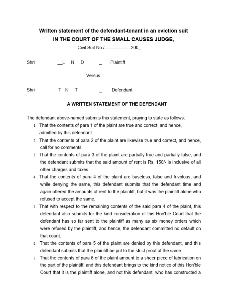Written Statement of The Defendant Tenant in An Eviction Suit IN THE